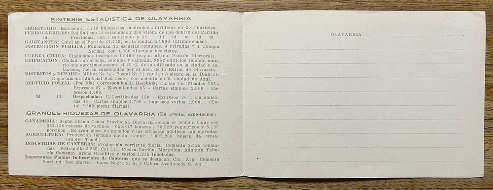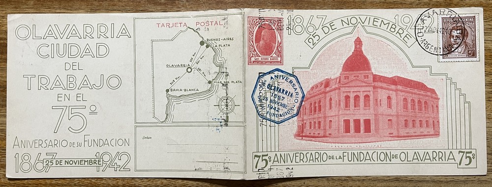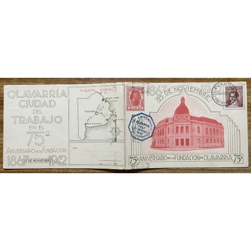 OLAVARRIA 1942 ANTIGUA TARJETA POSTAL DOBLE EN EL ANIVERSARIO DE LA FUNDACION