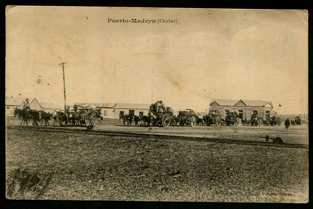 PUERTO MADRYN CHUBUT ANTIGUA TARJETA POSTAL CIRCULADA VISTA CARRETAS TRANSPORTANDO MERCADERIAS