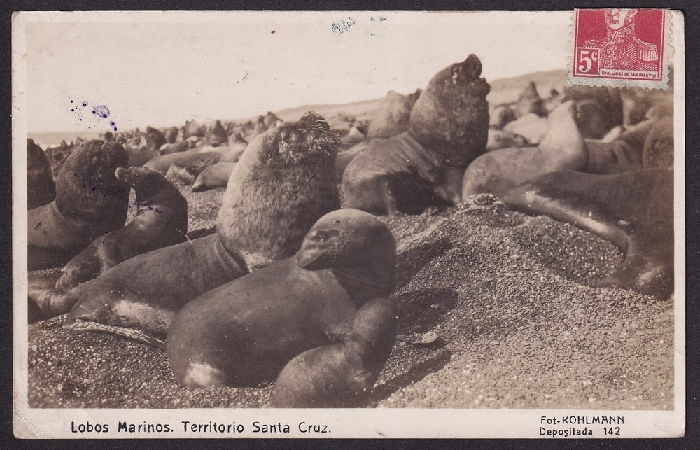 ARGENTINA 1928 PATAGONIA SANTA CRUZ ANTIGUA TARJETA POSTAL LOBOS MARINOS CIRCULADA CON MATASELLO DE FERROCARRIL