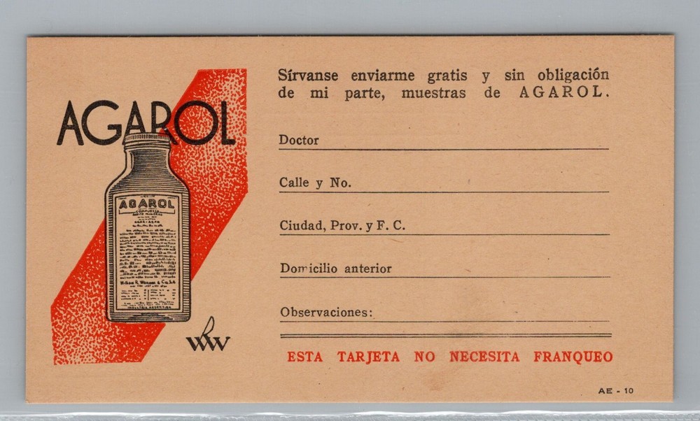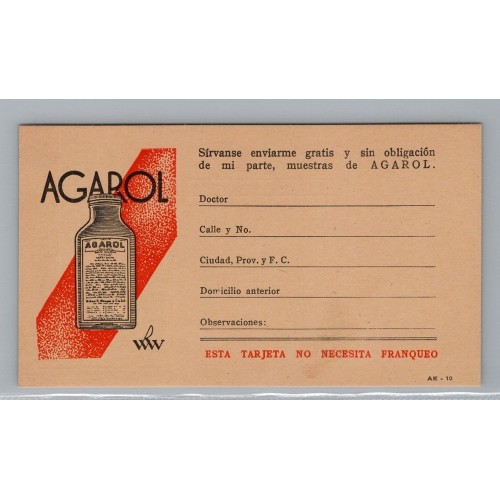 ARGENTINA 1930 AGAROL TARJETA PUBLICITARIA DE MEDICINA CON FRANQUEO PAGO, FECHA TENTATIVA