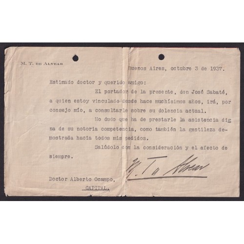 MARCELO T DE ALVEAR 1937 NOTA MEMBRETADA CON FIRMA AUTOGRAFA PRESIDENTE DE LA REPUBLICA Y DE LA UNION CIVICA RADICAL