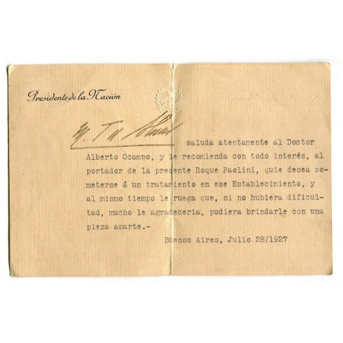 MARCELO T. DE ALVEAR NOTA DE PRESIDENCIA DE LA NACION CON FIRMA AUTOGRAFA DEL PRESIDENTE HOJA CON ESCUDO EN RELIVE
