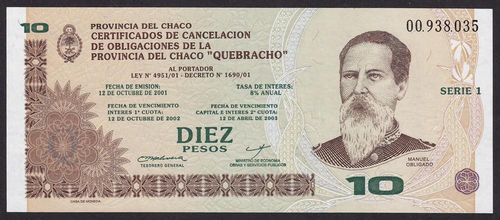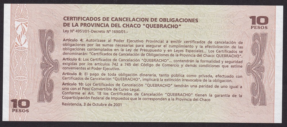 ARGENTINA EC. 248 BONO BILLETE CHACO DE 10 PESOS SIN CIRCULAR UNC QUEBRACHO