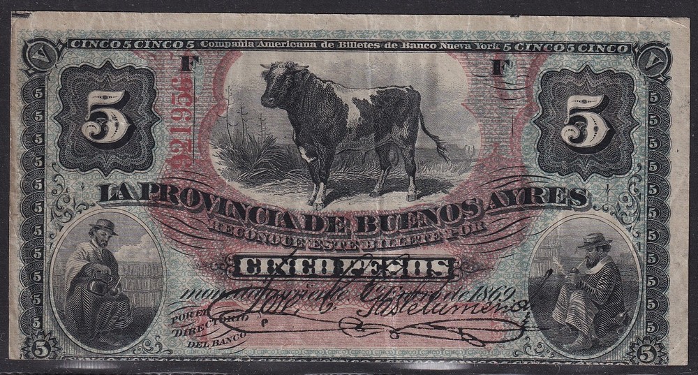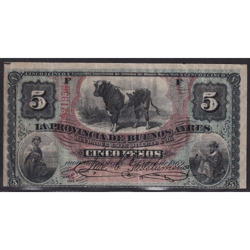 ARGENTINA 1869 BILLETE DE $ 5 PROVINCIA BUENOS AIRES GAUCHOS