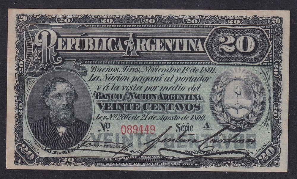 ARGENTINA COL. 030 BILLETE DE $ 0,20 FRACCIONARIO AÑO 1890 SIN CIRCULAR ES UNA NUMERACION MAS BAJA QUE LA CONSIGNADA EN EL CATALOGO MUY RARO