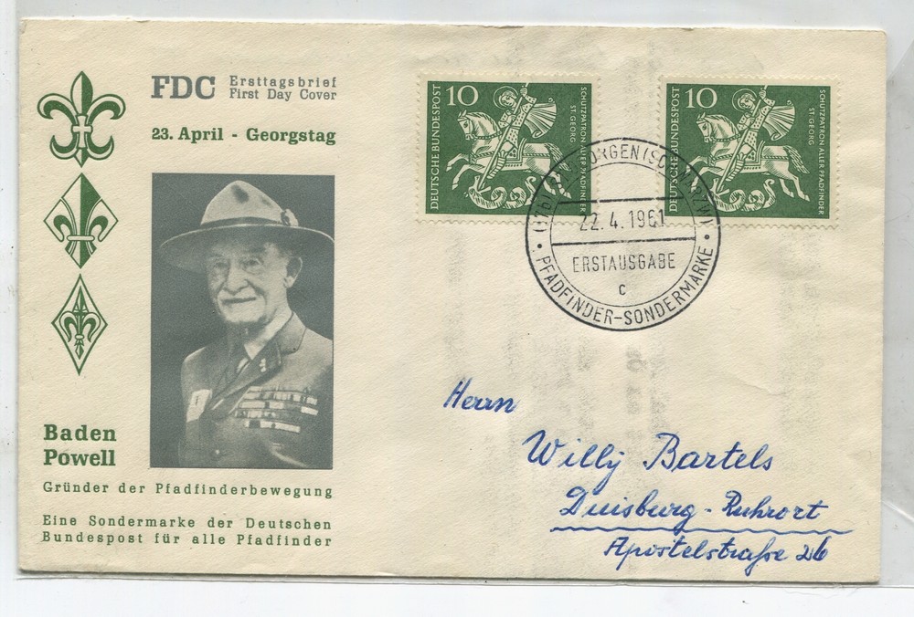 BOY SCOUT ALEMANIA 1961 SOBRE ILUSTRADO BADEN POWELL CON MATASELLO SCOUTS