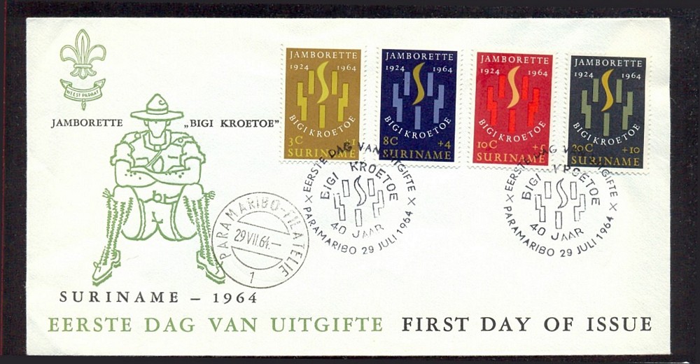 BOY SCOUTS SURINAME 1964 SOBRE CON SERIE COMPLETA DE ESTAMPILLAS SCOUT