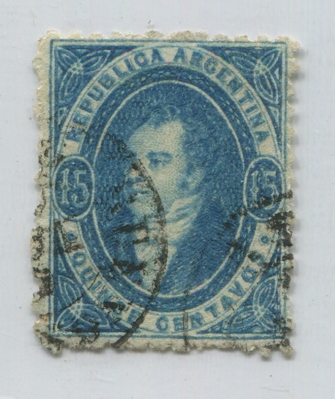 ARGENTINA 1864 GJ 24 RIVADAVIA 15 Cts. IMPRESIÓN SEMINITIDA MUY BONITA ESTAMPILLA