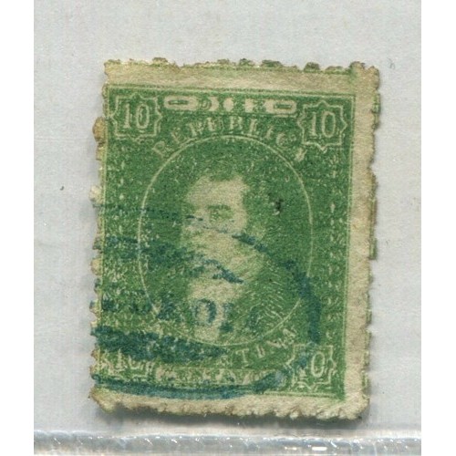 ARGENTINA 1864 GJ 23 RIVADAVIA ESTAMPILLA DE 10 Cts. MATASELLO CONCORDIA IMPRESIÓN BORROSA, LA TINTA GENERA UN CURIOSO ASPECTO COMO COAGULADA